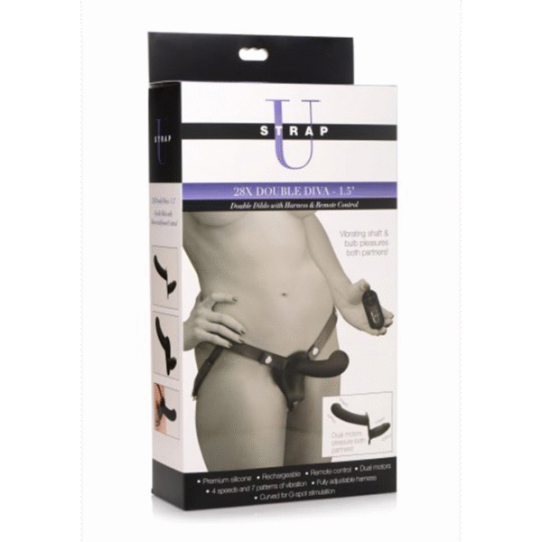 vibrator – dubbel plezier met harnas en afstandsbediening – XR Brands, Zwart XR Brands