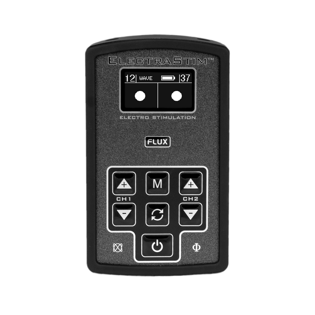 Flux is een elektro BDSM stimulator met twee uitgangen (dual channel). Dat betekent dat je twee sets elektroden tegelijk kunt gebruiken, bijvoorbeeld links/rechts, voor/achter of jij en je partner. De stimulator zelf is het hart van je elektrospel: hij stuurt de impulsen aan die jij via pads, ringen of andere elektro accessoires op je lichaam voelt.