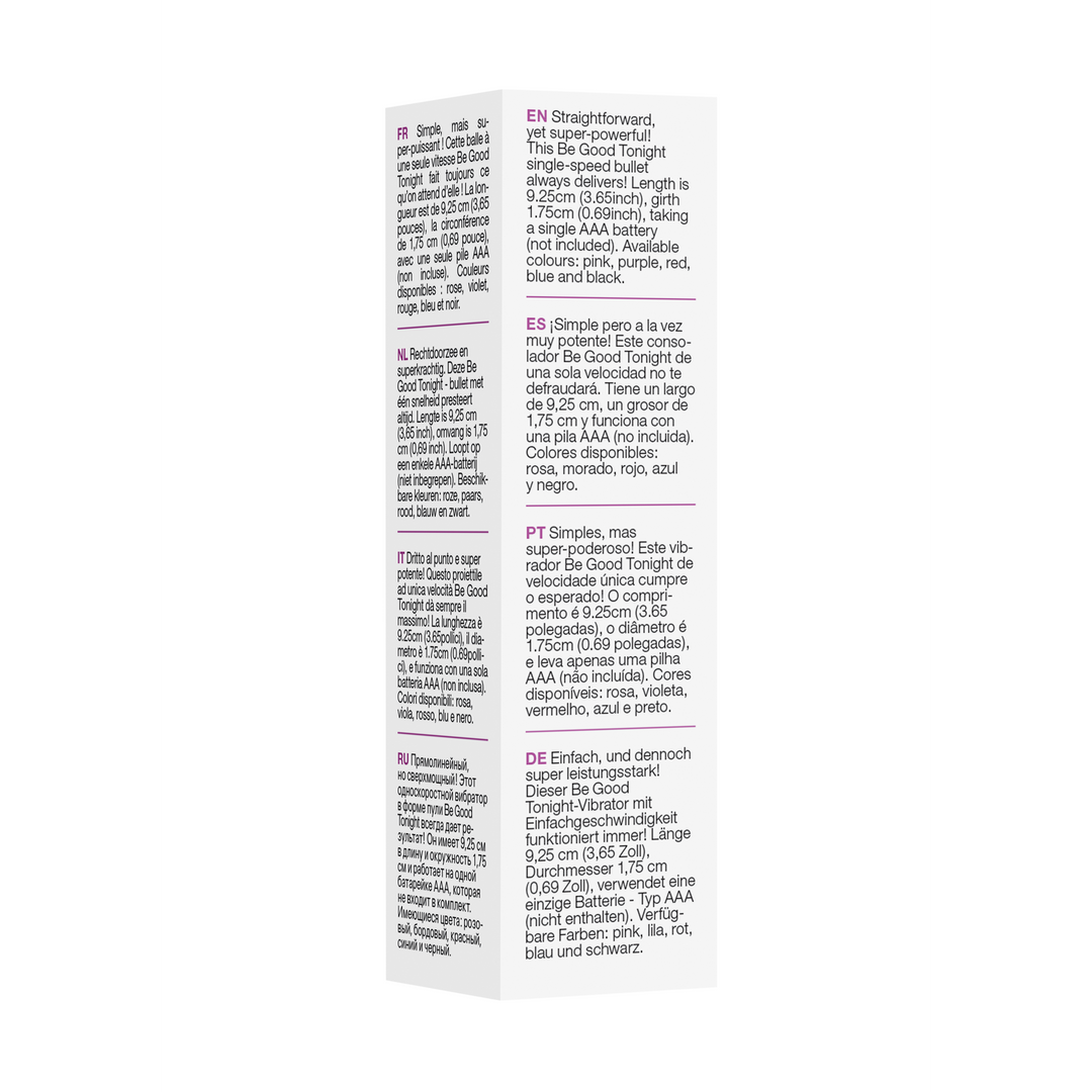 Rechtdoorzee en superkrachtig: de Be Good Tonight bullet met één snelheid is er voor iedereen die geen gedoe wil, maar wél die directe, doelgerichte trilling. Compact, strak en altijd klaar voor actie. De bullet is 9,3 cm lang, heeft een omvang van 1,8 cm, en werkt op één AAA-batterij (niet inbegrepen). Je kiest ‘m in jouw stijl: roze, paars, rood, blauw of zwart.