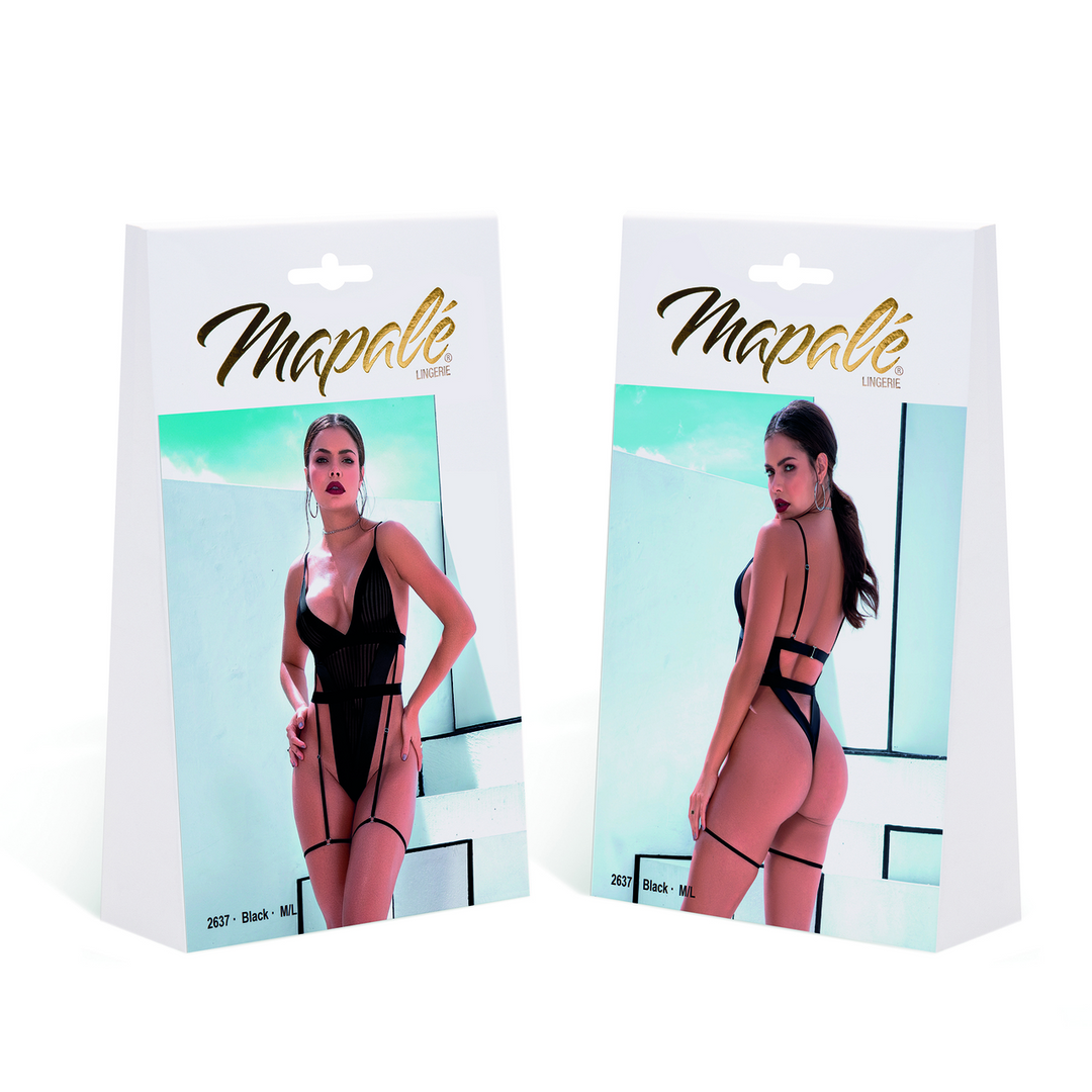 De metalen Z-haak en de haak-en-oog sluiting bij het kruis zijn subtiele details die de body net dat beetje functionele afwerking geven. Ze zijn onderdeel van het ontwerp en versterken de uitstraling. Doordat de kousenhouders bevestigd zijn, hoef je niet te rommelen met losse delen.