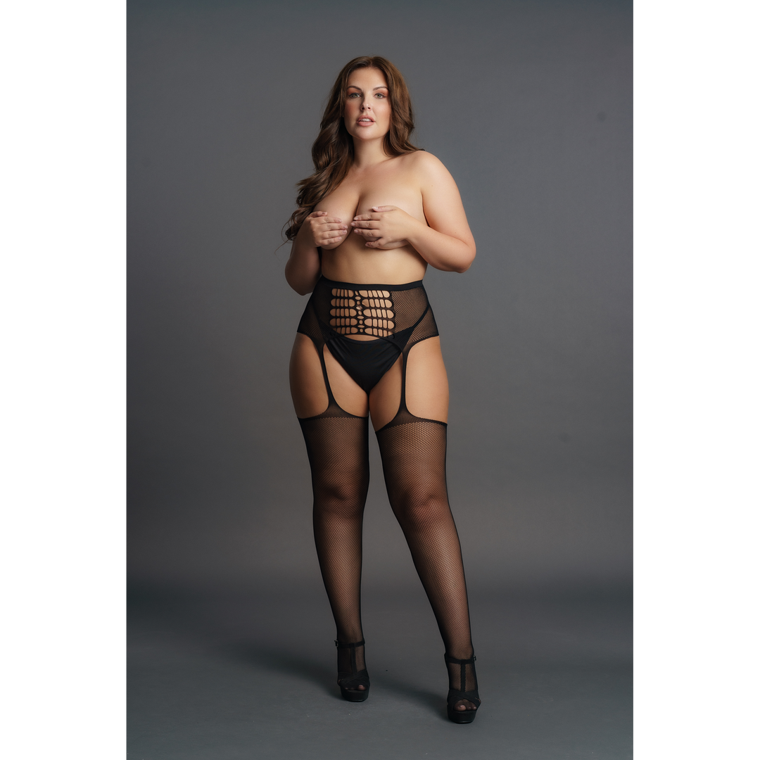 Voel de verandering zodra je dit jarretelset xxl aantrekt; het omarmt vormen en geeft zelfvertrouwen zonder te schreeuwen. De hoge taille tekent de contouren van je lichaam en laat een mooie overgang zien tussen taille en heupen. De combinatie van een klassieke achternaad met gescheurde details zorgt voor een onverwachte mix van elegantie en durf.
