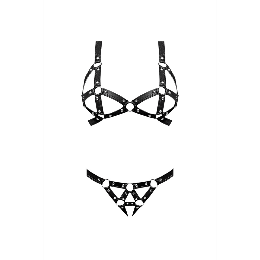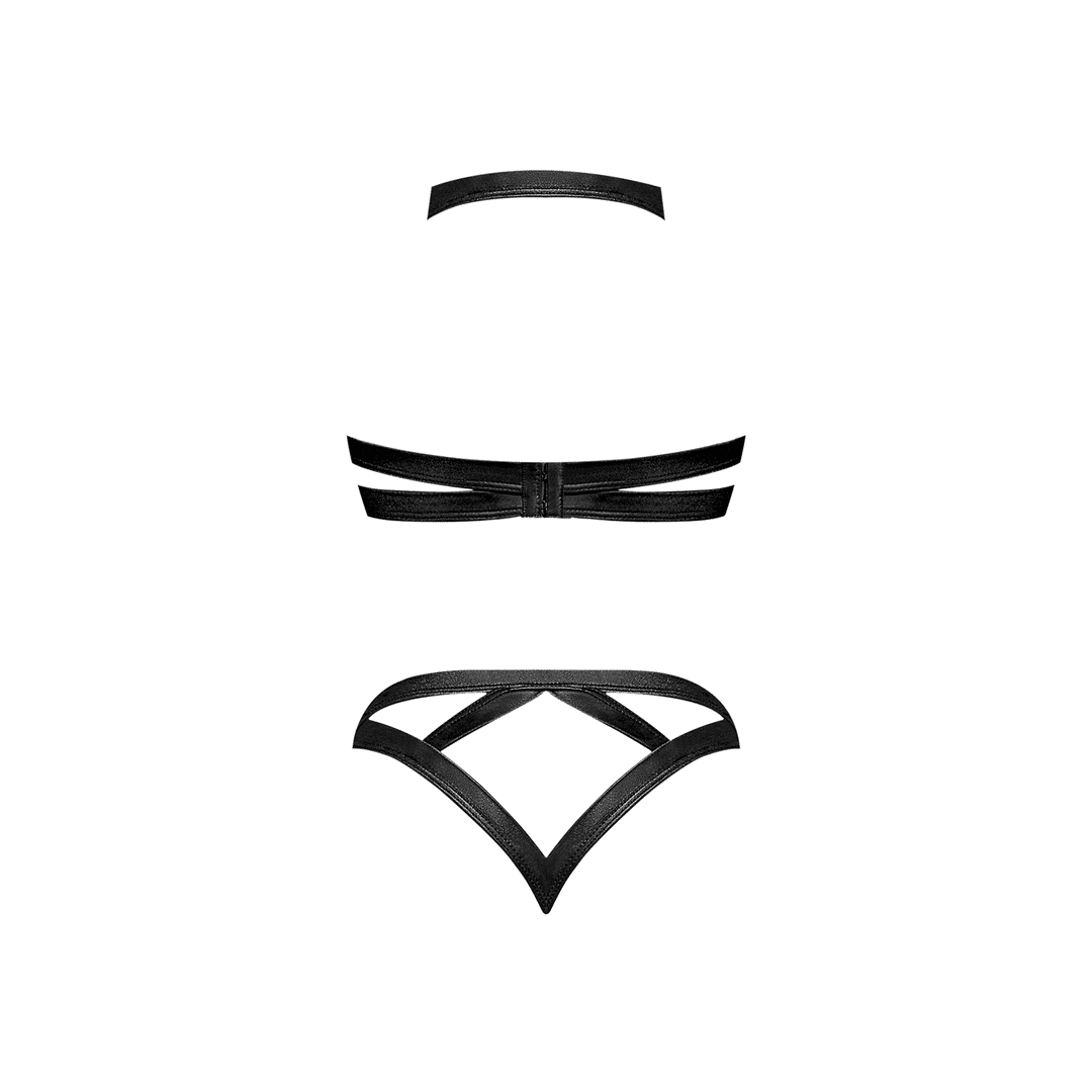 De combinatie van imitatie leer, studs en ringdetails geeft de set een duidelijke fetish en bondage geĂŻnspireerde uitstraling, maar zonder dat het te zwaar of overweldigend wordt. Het is een kinky outfit met een speelse inslag: stoer, zelfverzekerd en een tikkeltje rebels. De strappy details zorgen voor een edgy look die meteen opvalt.