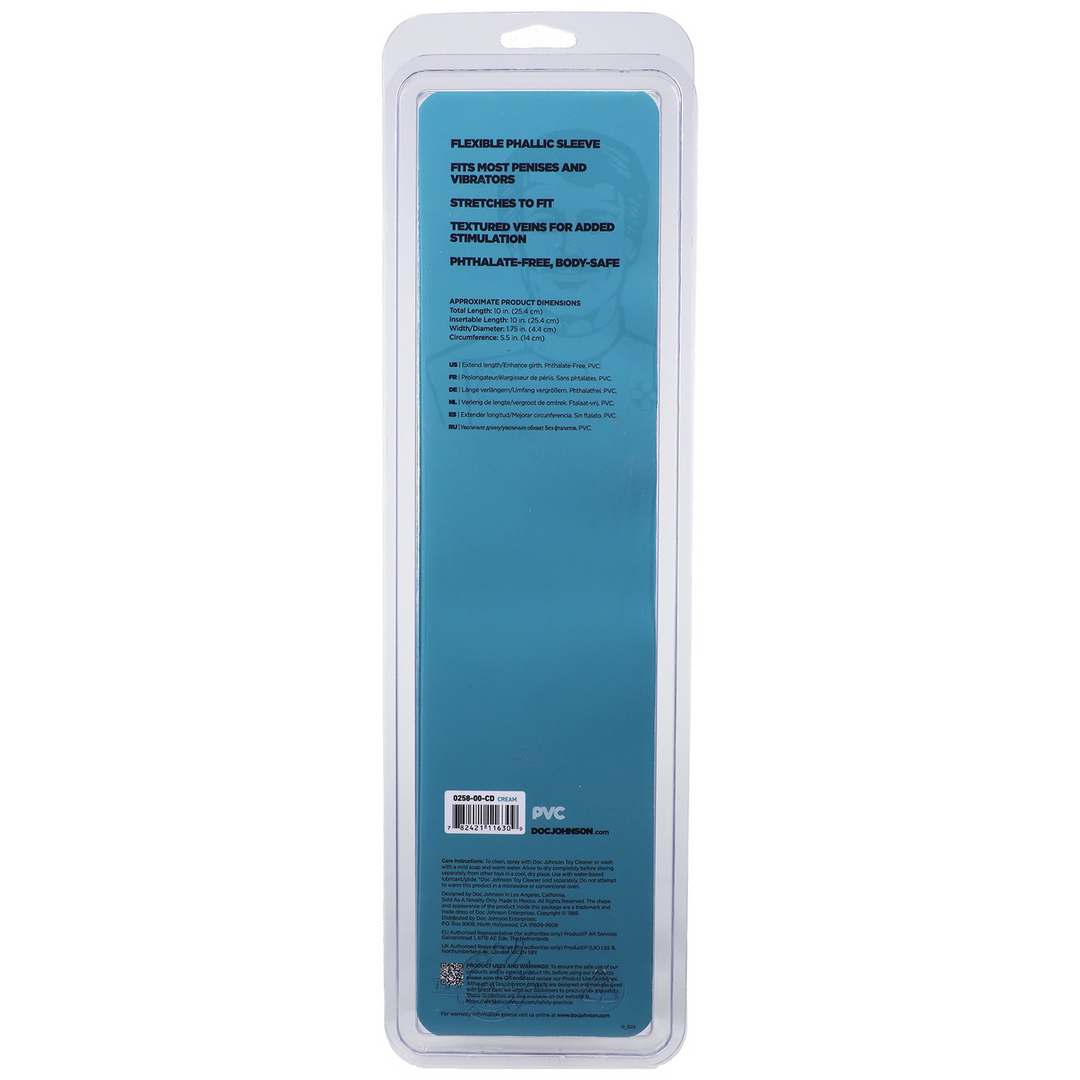 Zoek je een eenvoudige, effectieve manier om wat extra lengte en omtrek toe te voegen zonder ingewikkeld gedoe? Deze penis sleeve met holle opening – geïnspireerd op de 10,5 inch Cock Master van Doc Johnson – is gemaakt voor mannen die hun natuurlijke vorm net dat beetje extra willen geven. De sleeve schuift gemakkelijk over een stijve of semi-erecte penis en vormt door het vacuümeffect een stevige, aansluitende huls rondom je penis. De realistische getextureerde aderen zorgen voor een natuurlijke uitstraling en een intensere beleving voor jullie allebei, of je ‘m nu gebruikt tijdens solospel of samen met een partner.