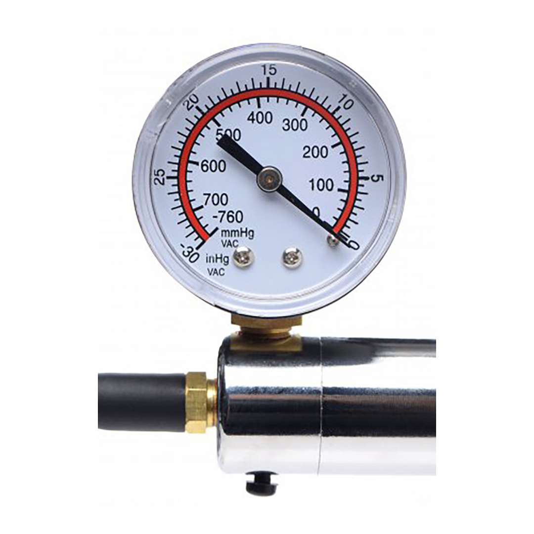 Bij elke knijpbeweging haal je wat lucht uit de cilinder. Hoe vaker je knijpt, hoe sterker het vacuüm wordt. De manometer op de pomp geeft hierbij een visuele indicatie van de druk in de cilinder. Je hoeft niet op precieze waarden te letten, maar je gaat vanzelf zien wat voor jou “normaal” is en wat je comfortabele speelruimte is.