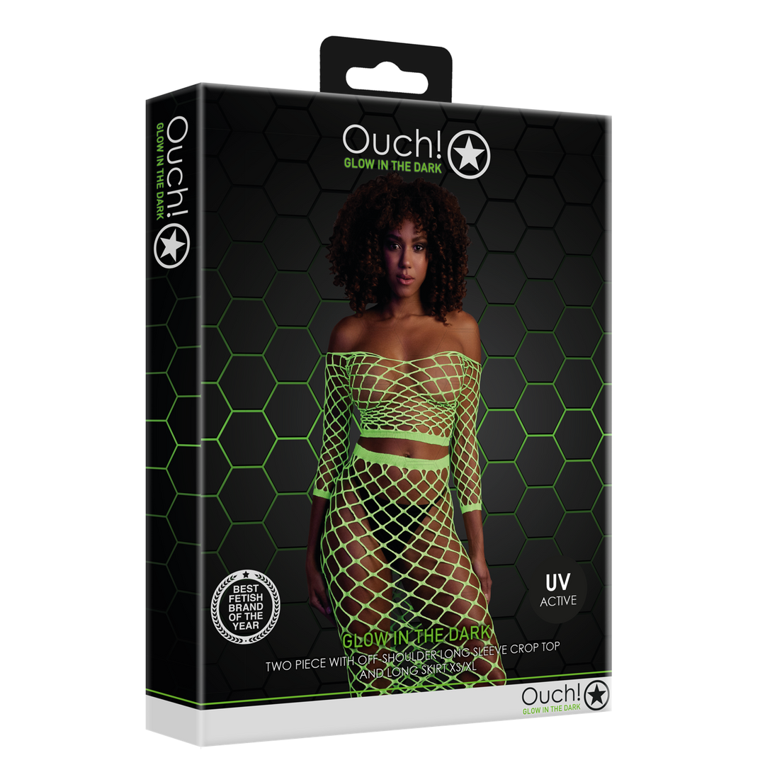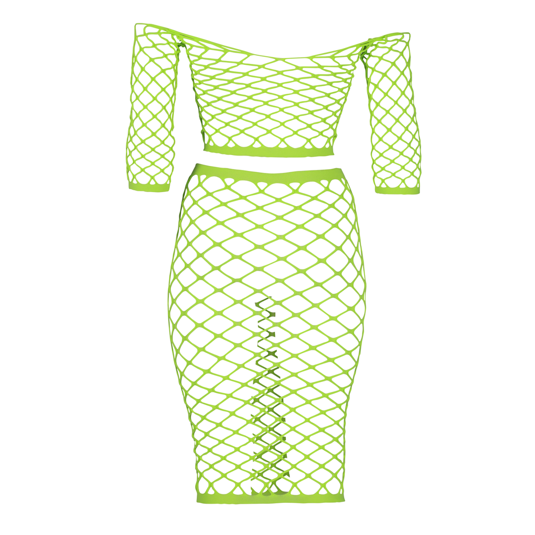 Een opvallende neonset die je direct in de spotlight zet: off-shoulder crop top met lange rok, UV-activatie en veel stretch voor een comfortabele fit.