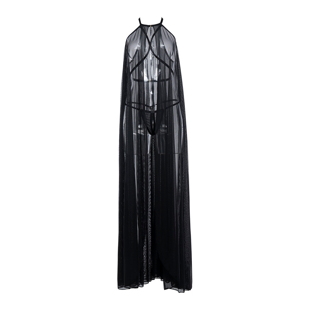 Trek deze set aan en voel meteen de theatrale uitstraling. De combinatie van een schouderbare sheer cape en een open voorkant G-string geeft een speelse en chique uitstraling. Het ontwerp legt de focus op schouders en halslijn en voelt luchtig en licht op de huid. Dit maakt het item ideaal voor wie houdt van subtiele verleiding zonder te veel poespas.