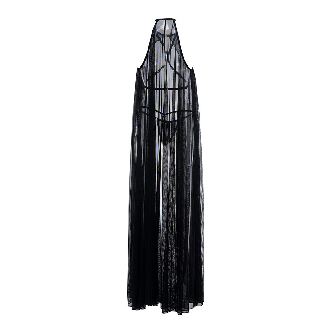 De cape valt langs de schouders en creëert een zachte omlijning van je bovenlichaam. Daardoor komt de hals en sleutelbeen extra goed uit. De open voorkant G-string zorgt voor een licht dramatisch contrast zonder veel bedekking weg te nemen.