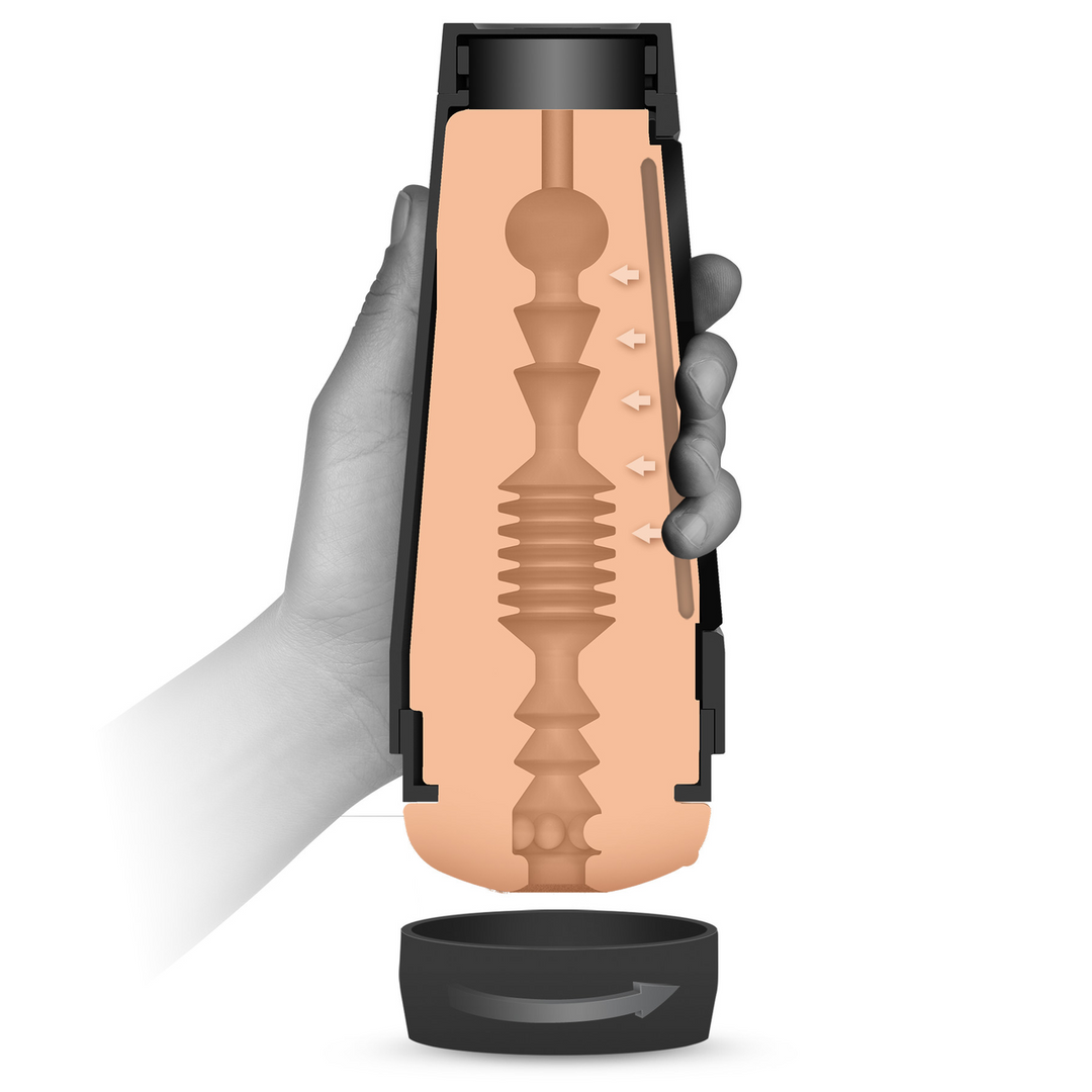 De stevige buitenbehuizing is niet alleen voor de looks: het geeft je tijdens gebruik veel extra controle. Doordat de buitenkant niet meeveert, kun je de masturbator stevig vastpakken zonder dat hij indeukt of uit je hand glijdt. Zeker als je handen wat gladder worden, is dat een groot pluspunt. Je hebt altijd betrouwbare grip, of je nu recht naar voren beweegt, een draaiende beweging maakt of van tempo wisselt.